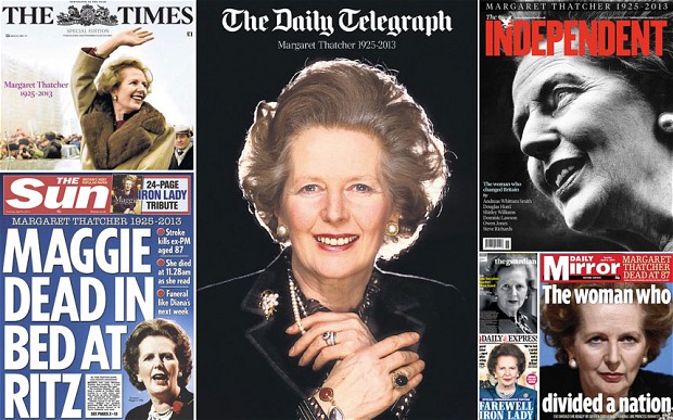 Είναι «Η γυναίκα που δίχασε ένα έθνος», για την Daily Mirror, «Η γυναίκα που διαμέλισε την Βρετανία» για την Morning Star, αλλά και «Η γυναίκα που έσωσε την Βρετανία» για την Daily Mail, «Θάτσερ: Η μεγάλη μεταρρυθμίστρια» για τους Financial Times.