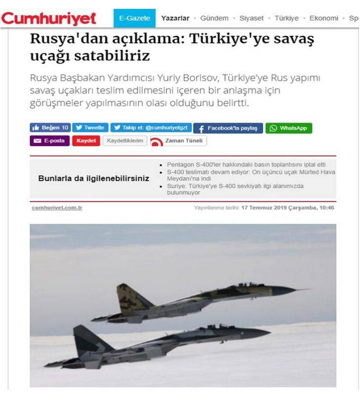 Συγκεκριμένα σε δημοσίευμα της τουρκικής εφημερίδας πως ως φωτογραφία εμφανίζονται ρωσικά Σουχόι 27, ο ρώσος αξιωματούχος φέρεται να δήλωσε μεταξύ άλλων τα εξής: «Γιατί να μην είναι εφικτό κάτι τέτοιο; Αυτό (μεταφορά κομματιών των S-400 στην Τουρκία) είναι ένα παράδειγμα για το πως είναι κάτι τέτοιο εφικτό από πλευράς μας».