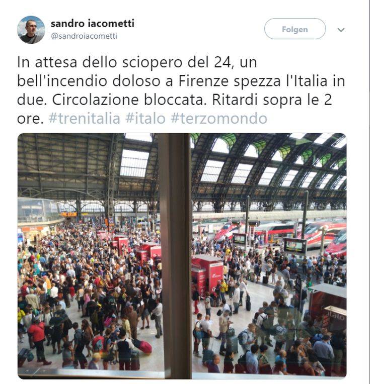 Μεγάλη ταλαιπωρία υπέστησαν όσοι ταξίδευαν σήμερα με τους ιταλικούς σιδηροδρόμους, λόγω των μεγάλων καθυστερήσεων και της ακύρωσης τουλάχιστον 25 δρομολογίων των τρένων υψηλής ταχύτητας, λόγω φωτιάς που έπληξε τις υποδομές γύρω από τη Φλωρεντία.