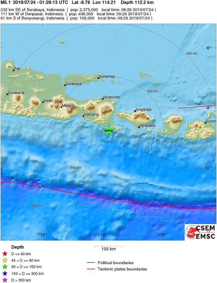 Ο σεισμός είχε εστιακό βάθος 112 χιλιόμετρα και σημειώθηκε 61 χιλιόμετρα από την Banyuwangi.