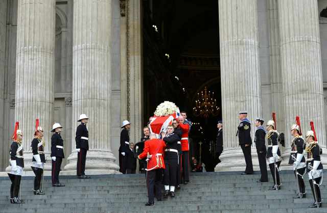 Με στρατιωτικές τιμές, σε μία τελετή κλειστή για το κοινό, υψηλοί προσκεκλημένοι είπαν το «τελευταίο αντίο» στην «Σιδηρά Κυρία», Μάργκαρετ Θάτσερ. Ανάμεσα στους και η βασίλισσα Ελισάβετ, κατά παράβαση του πρωτοκόλλου, καθώς και ο βρετανός πρωθυπουργός, Ντέιβιντ Κάμερον.