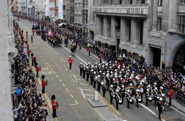 Στην ίδια την πομπή πήραν μέρος πάνω από 700 στρατιώτες, ναύτες και μέλη της αεροπορίας ενώ για την ασφάλεια των εκδηλώσεων βρέθηκαν επί ποδός περίπου 4.000 αστυνομικοί. Ωστόσο, δεν πέταξαν αεροσκάφη, σύμφωνα με την επιθυμία της «Σιδηράς Κυρίας».