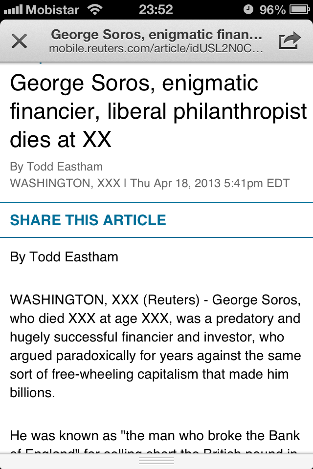 Σε μία απίστευτη γκάφα υπέπεσε χθες το ειδησεογραφικό πρακτορείο Reuters, το οποίο κατά λάθος «πέθανε» το μεγαλοεπενδυτή Τζορτζ Σόρος.