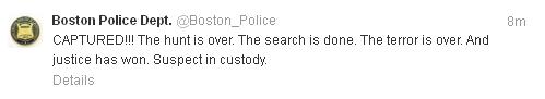 Όπως ανέφερε η αστυνομία της Βοστώνης μέσω του twitter: το ανθρωποκυνηγητό τελείωσε, η έρευνα ολοκληρώθηκε, ο τρόμος τελείωσε και η δικαιοσύνη νίκησε.