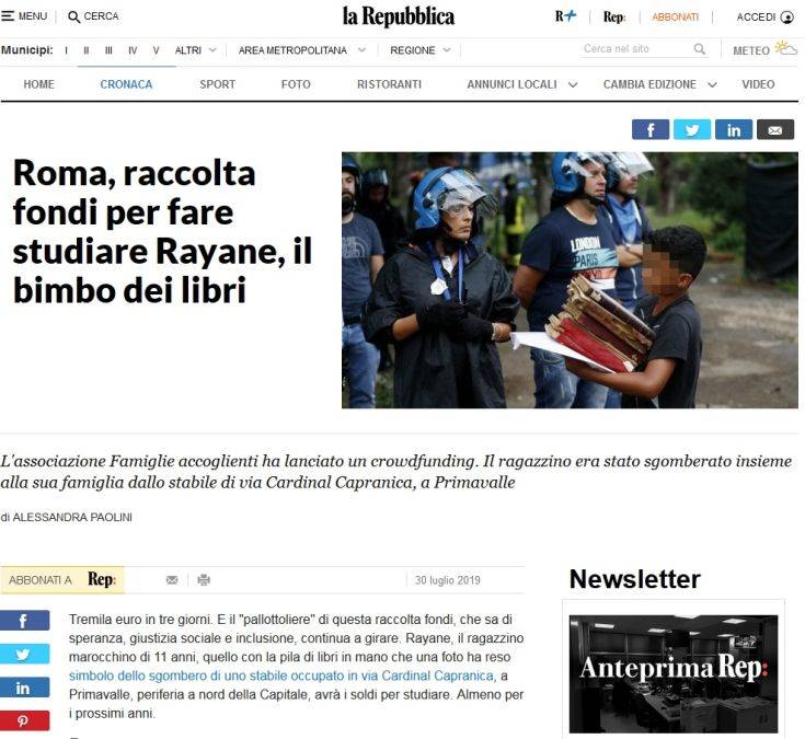 Η εικόνα του 11χρονου Ραγιάν από την Ιταλία είναι μία από αυτές που «στιγματίζουν» την εποχή μας. Η φωτογραφία του, με τα βιβλία στο χέρι, να περνά μπροστά από τους άνδρες των ειδικών δυνάμεων της αστυνομίας της Ιταλίας, που πρωτοστάτησαν στην εκκένωση του κατειλημμένου από άστεγες οικογένειες κτιρίου στην οδό Καρντινάλ Καπράνικα στο προάστιο Πριμαβάλε της Ρώμης, είχε συγκινήσει όλη τη χώρα.