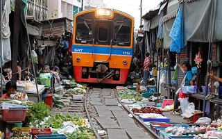 Ένα τρένο περνάει πάνω από 8 φορές τη μέρα ξυστά από μια αγορά σε στενούς δρόμους της Ταϊλάνδης. Τα βαγόνια περνούν μερικά εκατοστά δίπλα από τους πάγκους με τα προϊόντα, τα φρούτα, τα λαχανικά και τα θαλασσινά.