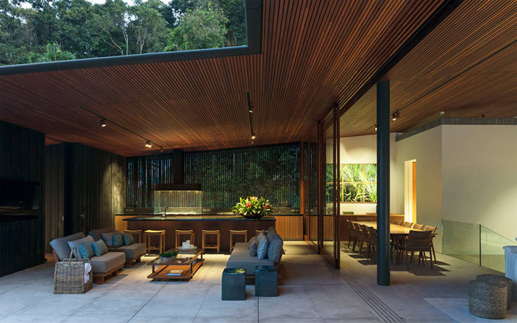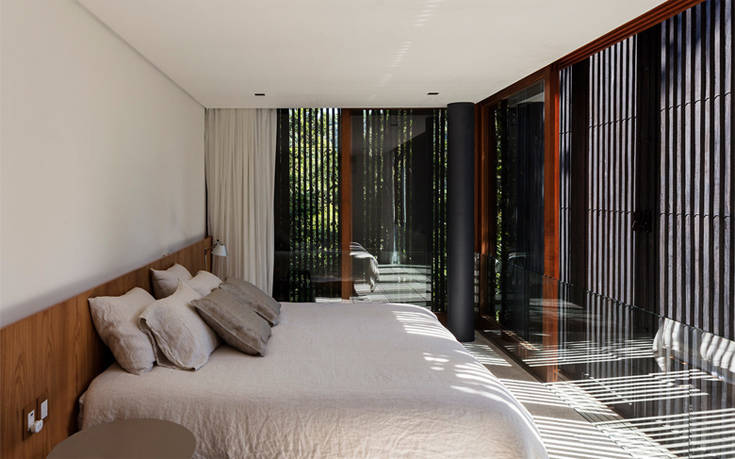 Το σπίτι των 730 τ.μ. μοιάζει απομονωμένο, χαμένο μέσα στο δάσος, ενώ είναι δίπλα κυριολεκτικά από την παραλία και κοντά στο βασικό οδικό δίκτυο της πόλης.