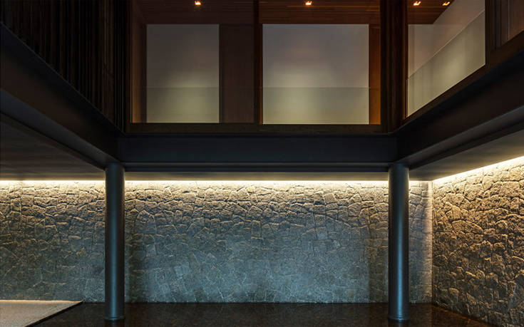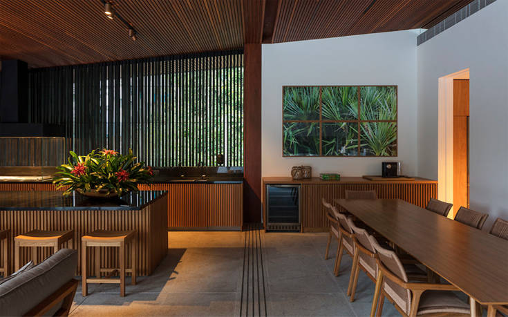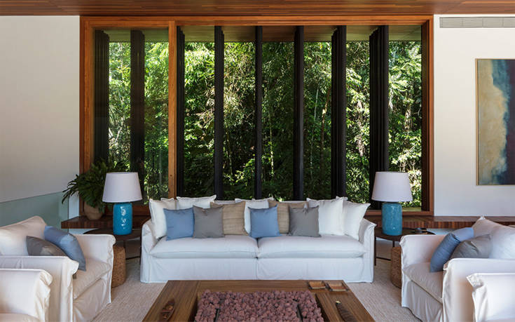 Όμοια με όλη την αισθητική της οικίας δηλαδή, που παρά την πρόδηλα μοντέρνα φύση της συνταιριάζεται με φυσικά υλικά, όπως το ξύλο και ο γρανίτης του πατώματος, ώστε να εναρμονίζεται η κατασκευή με το υπέροχο φυσικό περιβάλλον.