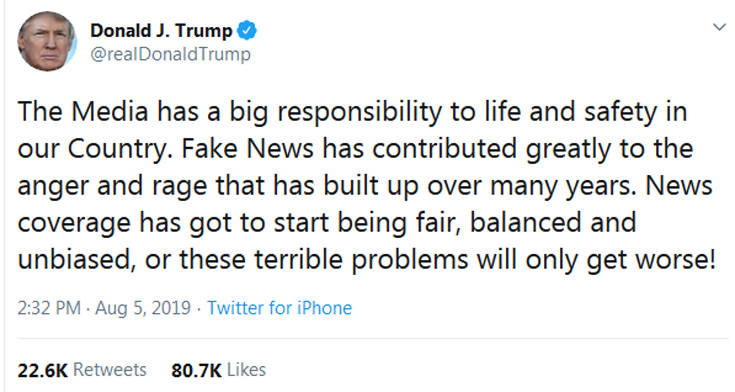 Ο πρόεδρος των ΗΠΑ Ντόναλντ Τραμπ κατηγόρησε σήμερα τα ΜΜΕ ότι συνέβαλαν «πολύ», διαδίδοντας «ψευδείς ειδήσεις», στον «θυμό και την οργή» στις ΗΠΑ, στον απόηχο των δύο πολύνεκρων επιθέσεων σε Τέξας και Οχάιο, που προκάλεσαν τον θάνατο 29 ανθρώπων.