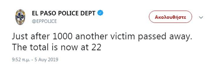 Δύο θύματα κατέληξαν στο νοσοκομείο σήμερα το πρωί, με αποτέλεσμα ο αριθμός των νεκρών από το μακελειό να ανέρχεται πλέον σε 22, σημειώνεται στο tweet της αστυνομίας του Ελ Πάσο.