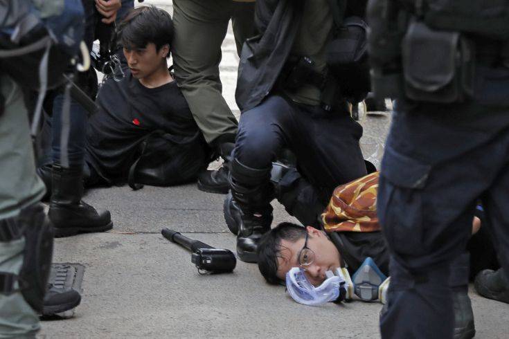 Στον κεντρικό σταθμό Wan Chai διαδηλωτές εκτόξευσαν στους αστυνομικούς μολότοφ και τούβλα.