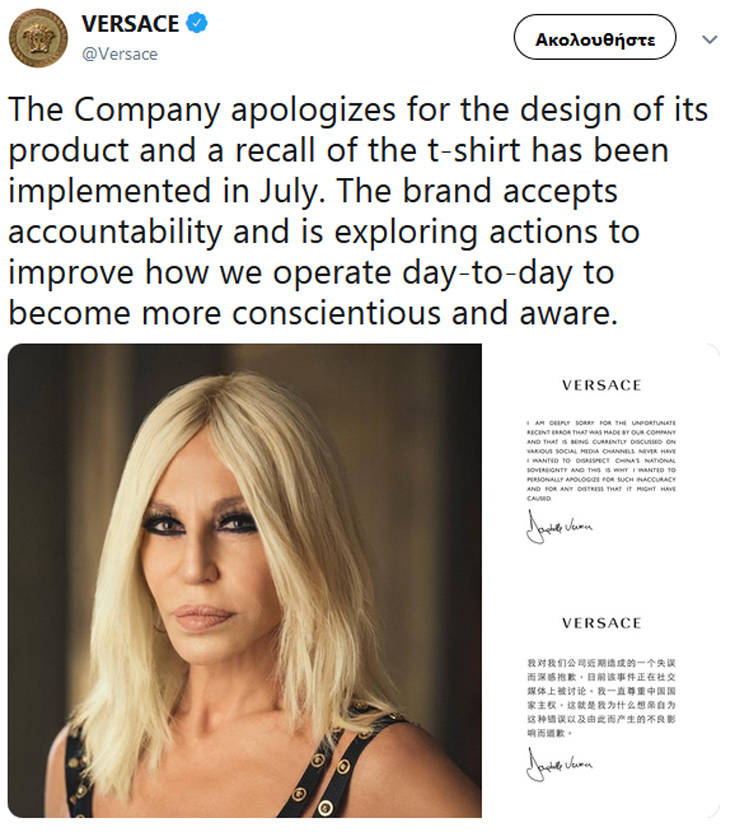 «Αγαπάμε την Κίνα και σεβόμαστε απολύτως την εθνική της κυριαρχία», σημείωνε ο Versace ήδη από χθες Κυριακή το βράδυ στον λογαριασμό του στο Weibo, το «κινεζικό Twitter».