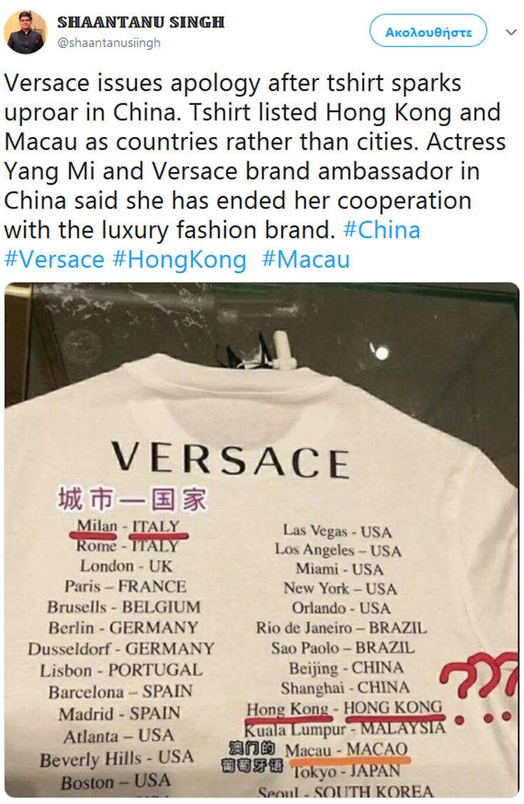 Η ιταλική εταιρεία Versace βρέθηκε στο στόχαστρο χθες Κυριακή για μια κοντομάνικη μπλούζα που κυκλοφόρησε στην οποία αναφέρονται κάποιες πόλεις μαζί με τη χώρα στην οποία ανήκουν, όπως για παράδειγμα «Παρίσι – ΓΑΛΛΙΑ» και «Σανγκάη – ΚΙΝΑ».