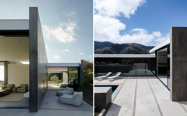 Το κυρίως σπίτι και το pool house απαρτίζουν λες έναν ενιαίο χώρο, καθώς αποτελούνται από τα ίδια υλικά και την ίδια αισθητική, με αυτούς τους μεγάλους και χοντρούς τοίχους που διατρέχουν την έκταση και προστατεύουν τους εσωτερικούς χώρους από τον ήλιο και τα αδιάκριτα μάτια.