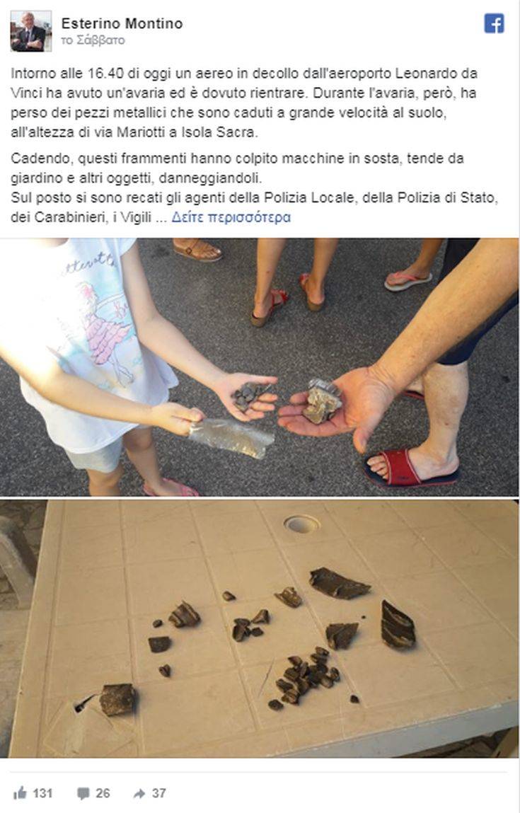 Σε ανάρτησή του στο Facebook, ο δήμαρχος του Fiumicino, Esterino Montino, έγραψε: «Περίπου στις 4:40 (τοπική ώρα) το Σάββατο, ένα αεροσκάφος που απογειώθηκε από το αεροδρόμιο Leonardo da Vinci υπέστη βλάβη και αναγκάστηκε να επιστρέψει. Κατά τη διάρκεια του περιστατικού ωστόσο, αποκόπηκαν από αυτό μεταλλικά θραύσματα τα οποία έπεσαν με μεγάλη ταχύτητα στο έδαφος. Κατά την πτώση τους, τα θραύσματα χτύπησαν σε παρκαρισμένα αυτοκίνητα, σε υπόστεγα κήπων και άλλα αντικείμενα, προκαλώντας ζημιές».