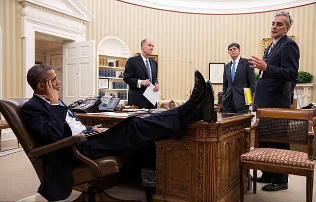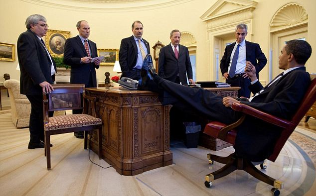 Όσον αφορά μάλιστα στην τελευταία συνήθεια που ο Μπάρακ Ομπάμα δείχνει να προτιμά, αν κρίνουμε από τις φωτογραφίες που ακολουθούν, συχνά το έπιπλο που φιλοξενεί τα πόδια του προέδρου είναι ένα γραφείο που είχε δοθεί δώρο στον Ράδερφορντ Χαίηζ από τη Βασίλισσα Βικτωρία, το 1880!