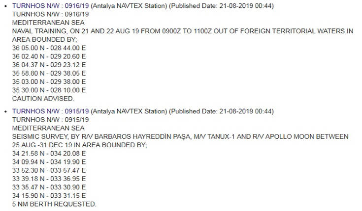 Συγκεκριμένα με την παράτυπη NAVTEX 0915/19 εξαγγέλει την δέσμευση μια μεγάλης περιοχής νότια της Μεγαλονήσου για «σεισμικές» έρευνες του Barbaros και του συνοδευτικού του R/V APOLLO MOON για το χρονικό διάστημα από τις 25 Αυγούστου μέχρι τις 31 Δεκεμβρίου.
