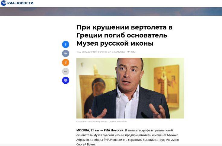 «Ο Μιχαήλ Αμπράμοβ, ο δημιουργός του πρώτου ιδιωτικού Μουσείου Ρωσικών Εικόνων στη Μόσχα, είναι νεκρός» αναφέρει στην ανάρτησή του, ο Λίντοφ.