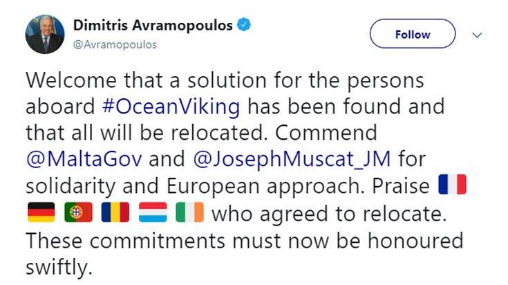 «Καλοδεχούμενο το ότι έχει βρεθεί λύση για τους ανθρώπους που βρίσκονται πάνω στο Ocean Viking και ότι όλοι θα μεταφερθούν» σε διάφορες χώρες, έγραψε ο Δημήτρης Αβραμόπουλος στο Twitter, για να επαινέσει τη Μάλτα, επειδή επέτρεψε στο σκάφος να δέσει και στους ανθρώπους που μεταφέρει να αποβιβαστούν εκεί.