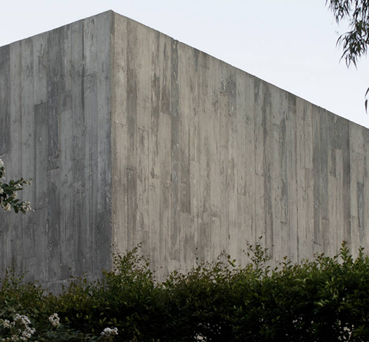 Όλο το σπίτι είναι κλεισμένο μέσα σε ένα τσιμεντένιο κέλυφος, που λειτουργεί αντιθετικά λες στο καταπράσινο του περιβάλλοντος χώρου.
