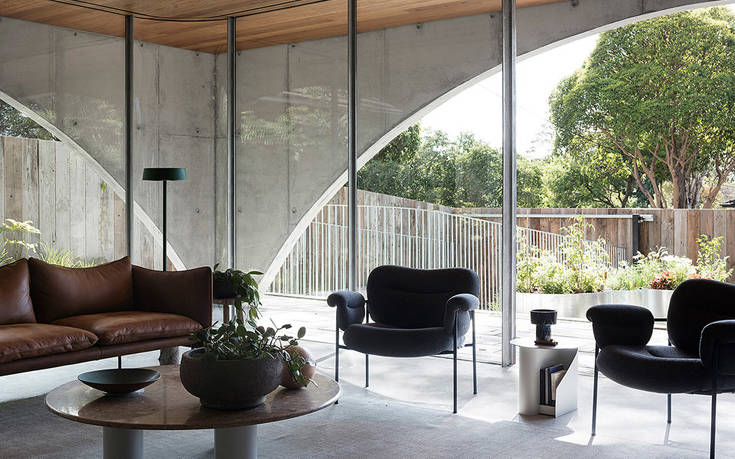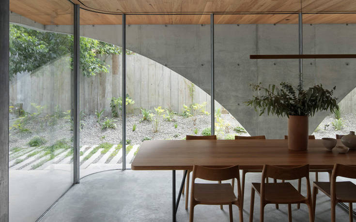 Τρία μεγάλα δέντρα οριοθέτησαν το εύρος και τη διάταξη της κατασκευής, και για να επικεντρώνεται το μάτι στο πράσινο και τη βλάστηση του κήπου, ένα θολωτό πλαίσιο επιστρατεύτηκε να παίξει τον ρόλο της… παρωπίδας.
