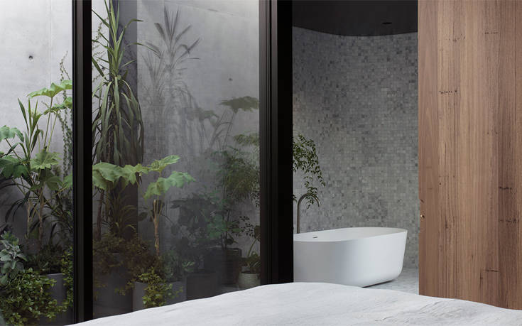 Το γυμνό μπετό διατηρείται ως διακοσμητικό μοτίβο και στο εσωτερικό, το οποίο σε συνδυασμό με τη μινιμαλιστική αισθητική και τα απλόχερα ανοίγματα απαλύνουν τη σκληρότητα του τσιμέντου.