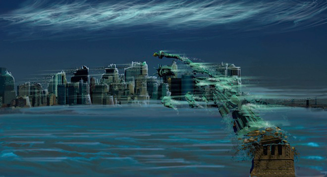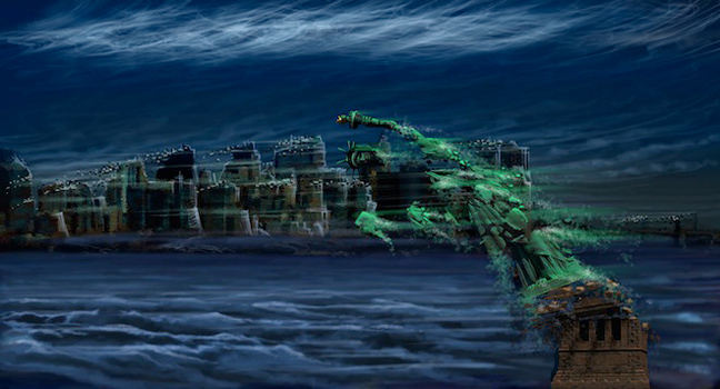 Η ατμόσφαιρα του παγωμένου «γίγαντα» αποτελείται από υδρογόνο και ήλιο, με κολοσσιαία σύννεφα μεθανίου, που φαίνονται πάνω από την κορυφογραμμή των ουρανοξυστών της Νέας Υόρκης και δημιουργούν τη μαγευτική γαλαζοπράσινη αύρα. Δυστυχώς βέβαια, οι τρομακτικοί τυφώνες θα έσβηναν από τον χάρτη τη μητρόπολη σε σύντομο χρονικό διάστημα…