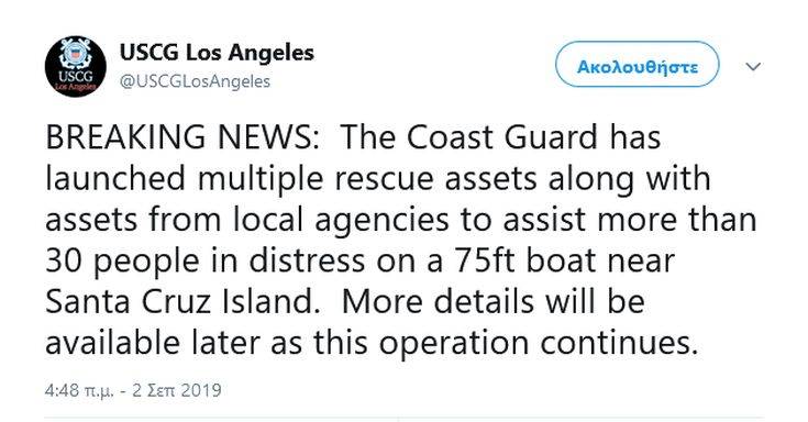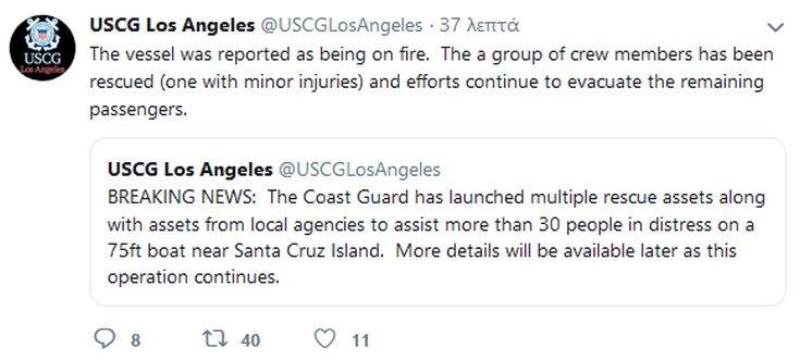 Συναγερμός σήμανε στην αμερικανική Ακτοφυλακή ύστερα από αναφορές ότι σκάφος στην Καλιφόρνια με 30 ανθρώπους έχει τυλιχθεί στις φλόγες, κοντά στο νησί Σάντα Κρουζ.