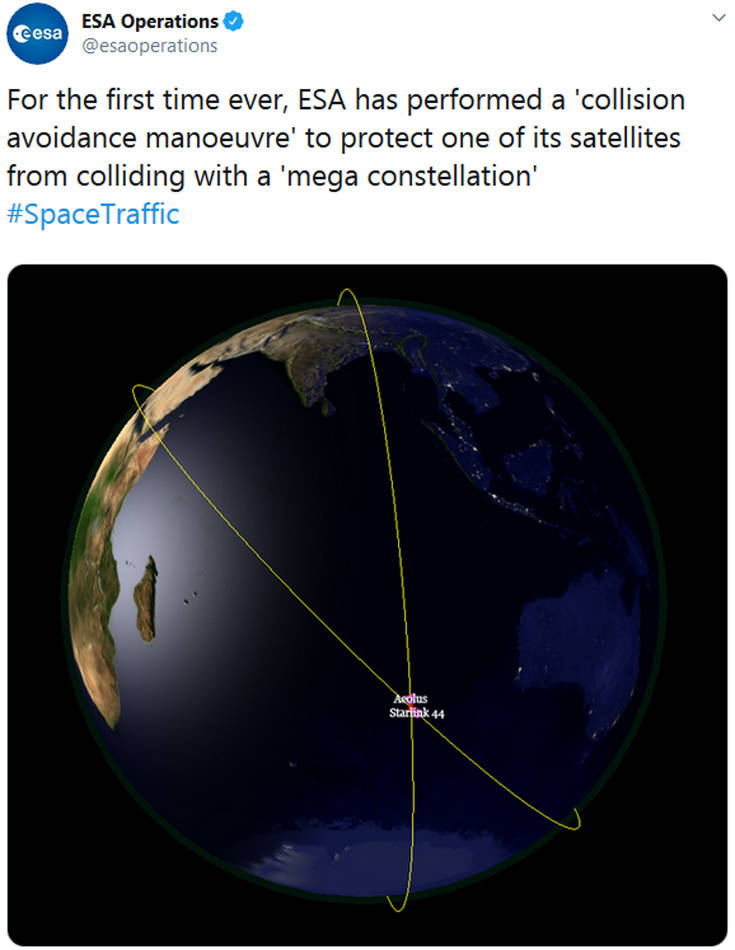 «H ESA πραγματοποίησε για πρώτη φορά χθες μια μανούβρα αποφυγής (αύξησης του ύψους της τροχιάς) για να προστατεύσει τον δορυφόρο Aeolus από σύγκρουση με έναν από τους δορυφόρους του παγκόσμιου δικτύου Ίντερνετ Starlink της αμερικανικής ιδιωτικής εταιρείας αεροδιαστημικής τεχνολογίας SpaceX», ανέφερε σε ανάρτηση στο Twitter, σύμφωνα με το Αθηναϊκό Πρακτορείο Ειδήσεων.