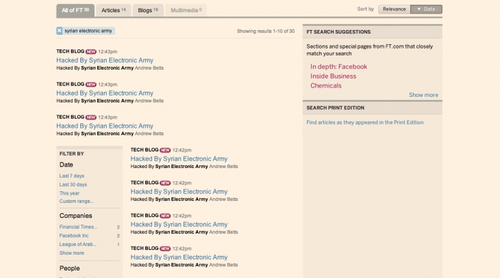 Ο ιστότοπος της εφημερίδας Φαϊνάνσιαλ Τάιμς δέχθηκε σήμερα επίθεση από μία ομάδα πειρατών του κυβερνοχώρου, η οποία αυτοαποκαλείται «Ηλεκτρονικός Συριακός Στρατός», φέρεται ότι πρόσκειται στην κυβέρνηση της Δαμασκού και είχε επιτεθεί σε πολλά άλλα μέσα ενημέρωσης πριν από το βρετανικό οικονομικό φύλλο.