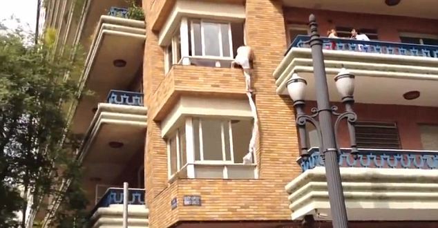 Από ένα παράθυρο του διαμερίσματος, εμφανίζεται ένας άλλος άντρας, ο οποίος προσπαθεί κυριολεκτικά να δραπετεύσει από το σπίτι χρησιμοποιώντας ένα «σκοινί» από δεμένα ρούχα!