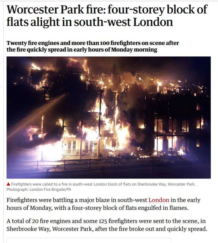Η φωτιά εκδηλώθηκε σε κτίριο της περιοχής Sherbrooke Way, στο Worcester Park. Στο σημείο έσπευσαν 20 οχήματα της Πυροσβεστικής με 125 πυροσβέστες, οι οποίοι έδωσαν μάχη με τις φλόγες.