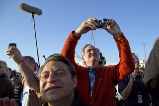 Ο ιδρυτής της Scaled Composites και θρύλος της αεροδιαστημικής βιομηχανίας Burt Rutan απαθανατίζει στιγμιότυπα με τη μηχανή του, ενώ σε πρώτο πλάνο βλέπουμε τον ιδιοκτήτη της X-Prize Πίτερ Διαμαντή…
