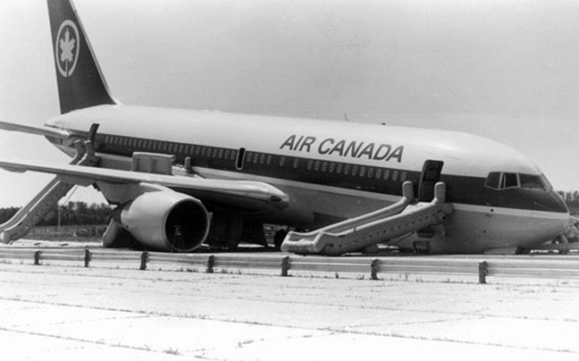 Η πτήση της Air Canada ξεκίνησε βάσει προγράμματος, παρά την ένδειξη ότι οι μετρητές καυσίμου δε λειτουργούσαν. Αν και έγιναν χειροκίνητοι έλεγχοι, το καύσιμο δεν επαρκούσε για την ολοκλήρωση της πτήσης. Σε ύψος 41.000 ποδιών (περίπου 12,5 χλμ), τα όργανα ένδειξης πίεσης καυσίμου νέκρωσαν και ο κυβερνήτης Μπομπ Πήρσον αποφάσισε να προσγειωθεί στην πόλη Γουίνιπεγκ. Η μια τουρμπίνα έσβησε, ακολούθησε και η άλλη, και το Μπόινγκ κατέληξε να πλανάρεται (δηλαδή να ίπταται με σβηστές μηχανές) στον αέρα. Το μικρό αεροδρόμιο στο Γκίμλι βρισκόταν σε μικρότερη απόσταση από το Γουίνιπεγκ, οπότε αποφασίστηκε να κατευθύνουν το αεροπλάνο προς τα εκεί. Αυτό που δεν ήξεραν τα μέλη του πληρώματος ήταν πως ένας από τους διαδρόμους του Γκίμλι είχε μετατραπεί σε ιππόδρομο και χρησιμοποιούταν εκείνη τη μέρα. Καθώς το πλοίο προσγειωνόταν και γλιστρούσε για πάνω από μισό χιλιόμετρο, οι θεατές σκόρπιζαν όσο γρηγορότερα μπορούσαν. Οι δέκα τραυματισμοί από την ανώμαλη προσγείωση ήταν ελαφριοί. Δεν υπήρξε κίνδυνος φωτιάς κατά την προσγείωση, μιας και οι τρεις δεξαμενές καυσίμου ήταν τελείως άδειες και η έρευνα που ακολούθησε έδειξε πως υπεύθυνοι ήταν οι πιλότοι, οι μηχανικοί και η εταιρεία.