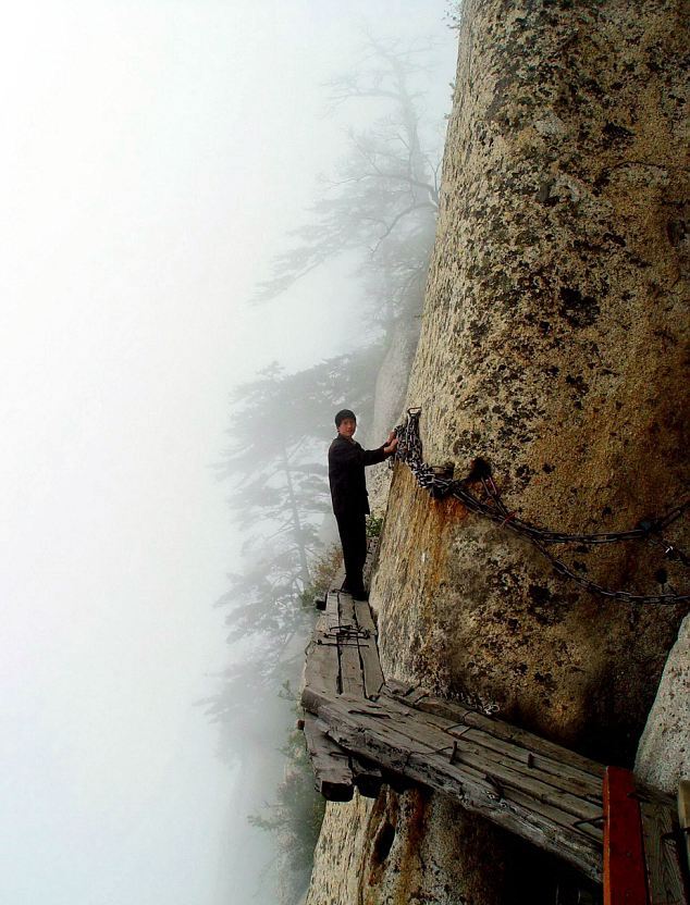Παράτολμοι τουρίστες που λατρεύουν την περιπέτεια καταφθάνουν στο απόκρημνο όρος Haushan που βρίσκεται στην επαρχία Shaanxi της Κίνας για να περπατήσουν επάνω στις… σανίδες στο… τρομακτικό μονοπάτι Chang Kong.