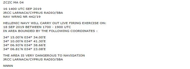 Επισημαίνεται ακόμα πως σύμφωνα με NAVTEX που εξέδωσε η Λευκωσία, όπως αναφέρει το news.gr, το Πολεμικό Ναυτικό της Ελλάδας θα πραγματοποιήσει άσκηση με πραγματικά πυρά στις 18 Σεπτεμβρίου σε περιοχή μεταξύ Κύπρου και Λιβάνου.