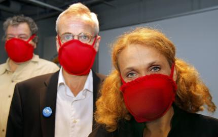 Οι τιμημένοι με το βραβείο Νόμπελ Ρόι Γκλάουμπερ (Νόμπελ Φυσικής, 2005), αριστερά, Σέλντον Γκλάσοου (Νόμπελ Φυσικής, 1979), κέντρο και Τζέιμς Μούλερ (Νόμπελ Ειρήνης, 1985), φορούν γυναικεία σουτιέν στα πρόσωπά τους ενώ δείχνουν πώς μπορούν να χρησιμοποιηθούν ως αντιασφυξιογόνες μάσκες έκτακτης ανάγκης κατά την διάρκεια μιας παράστασης στην τελετή απονομής των Βραβείων Nobel Ig.