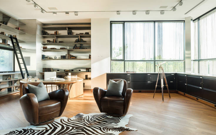 Τα 981 τ.μ. του εσωτερικού φιλοξενούν 3 κρεβατοκάμαρες, 3 μπάνια και αυτόν τον πύργο που στεγάζει τη βιβλιοθήκη, το γραφείο και μια αίθουσα-παρατηρητήριο στη φύση.