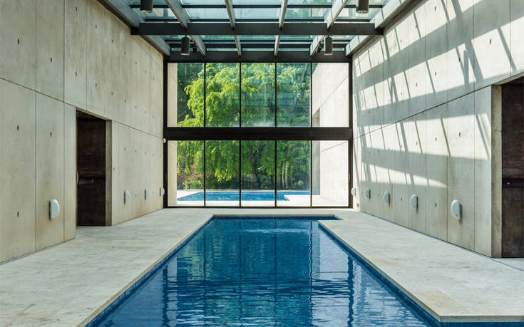 Εσωτερική και εξωτερική πισίνα, πέτρινα πατώματα και τεράστια ανοίγματα συμπληρώνουν το θαύμα, αλλά και ένα αγροτόσπιτο 325 τ.μ. μέσα στην τεράστια έκταση των 15,95 στρεμμάτων, που περιλαμβάνει ακόμα και αχυρώνα και ειδικά διαμορφωμένο χώρο για ιππασία.