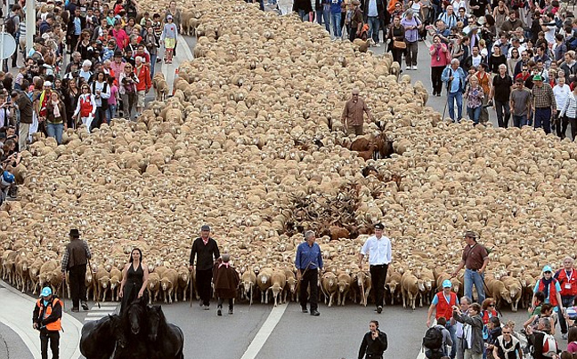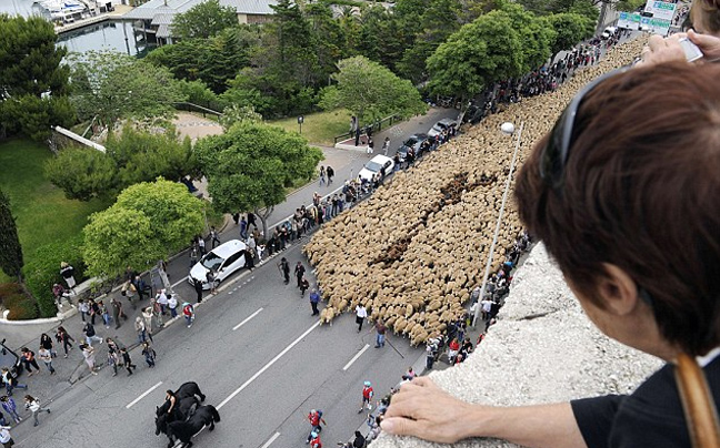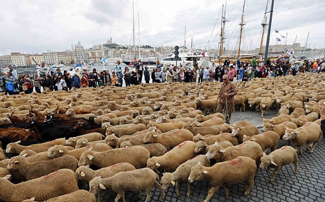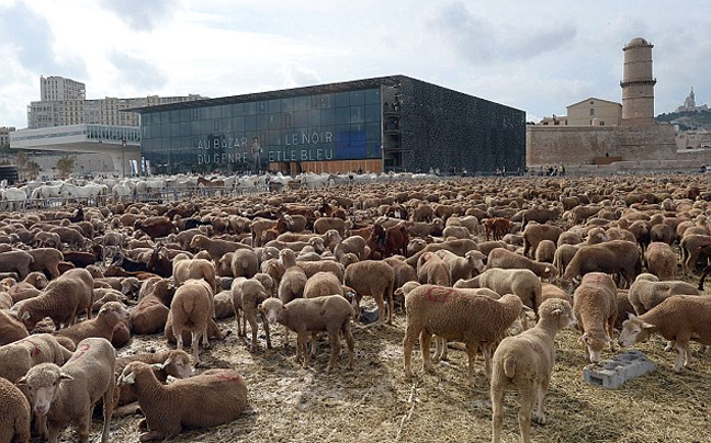 Μία μαυροντυμένη γυναίκα, όρθια πάνω σε ένα άλογο οδήγησε χιλιάδες πρόβατα μέσα από τη Μασσαλία, στη Γαλλία, στο πλαίσιο των εορτασμών για την ανάδειξη της περιοχής σε Πολιτιστική Πρωτεύουσα της Ευρώπης για το 2013.
