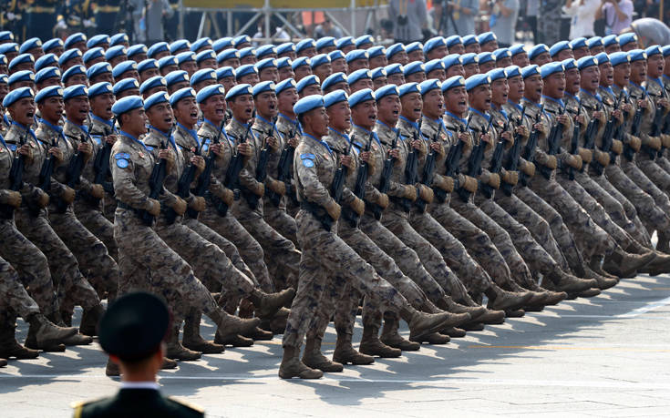 Οι κυανόκρανοι οι οποίοι τέθηκαν επικεφαλής της παρέλασης έχουν συμμετάσχει σε ειρηνευτικές επιχειρήσεις των Ηνωμένων Εθνών στη Λιβερία, στο Μαλί, στη Λαϊκή Δημοκρατία του Κονγκό, στον Λίβανο, στο Σουδάν και στο Νότιο Σουδάν. Η Κίνα έχει αναπτύξει πάνω από 40.000 στελέχη του στρατιωτικού προσωπικού της σε 24 ειρηνευτικές αποστολές του ΟΗΕ, με 13 κινέζους κυανόκρανους να έχουν θυσιάσει τη ζωή τους στα μέτωπα ή σε επιχειρήσεις. Πάνω από 2.500 κινέζοι στρατιωτικοί συμμετέχουν το τρέχον διάστημα σε τέτοιου είδους διεθνείς αποστολές. Η Κίνα έχει μετατραπεί στη χώρα με τη μεγαλύτερη συμβολή στις ειρηνευτικές αποστολές του ΟΗΕ από τα πέντε κράτη-μόνιμα μέλη του Συμβουλίου Ασφαλείας.