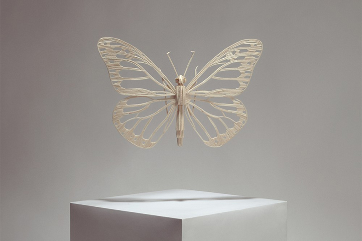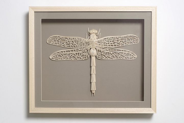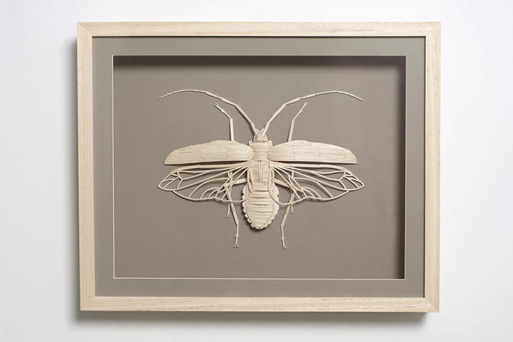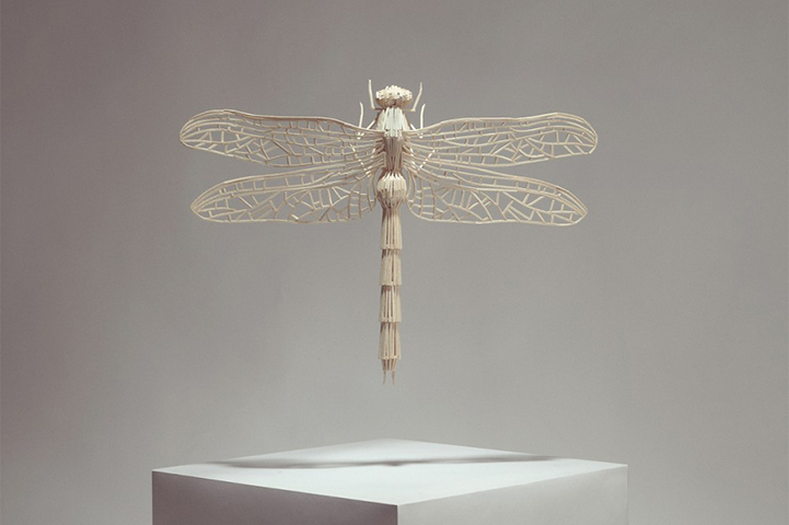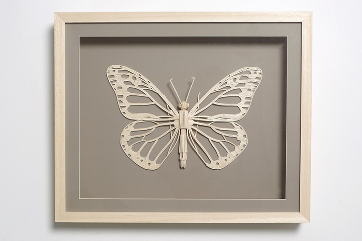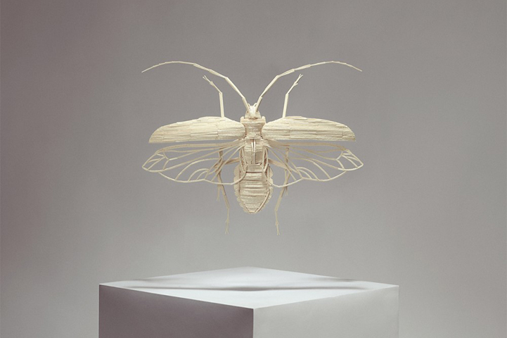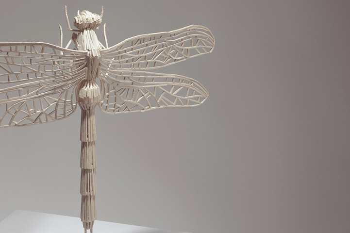Στη συγκεκριμένη περίπτωση όμως σκέφτηκε να βρεθεί ένα βήμα πιο κοντά στη φύση φτιάχνοντας τρισδιάστατα έντομα από σπίρτα. Ορισμένα από αυτά αιωρούνταν στο χώρο, ενώ άλλα τοποθετήθηκαν σε κορνίζες.