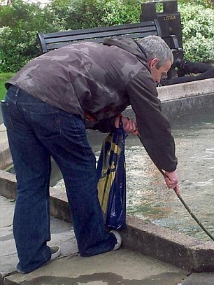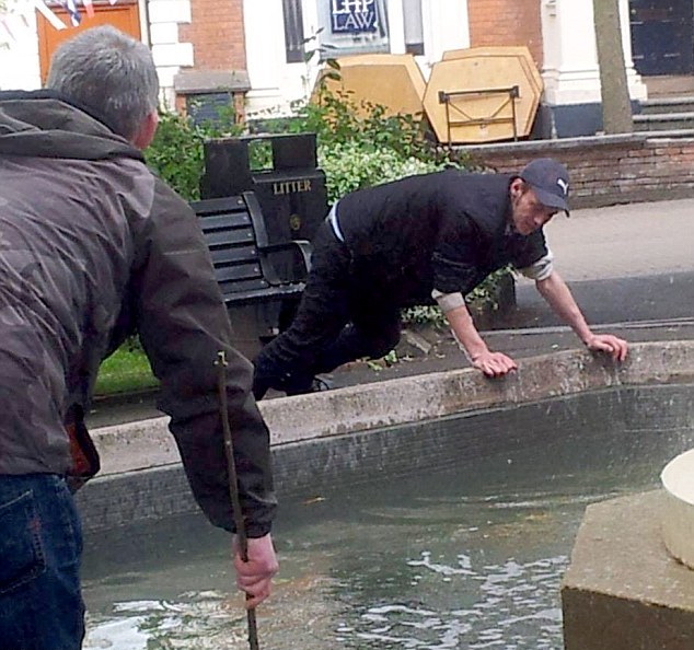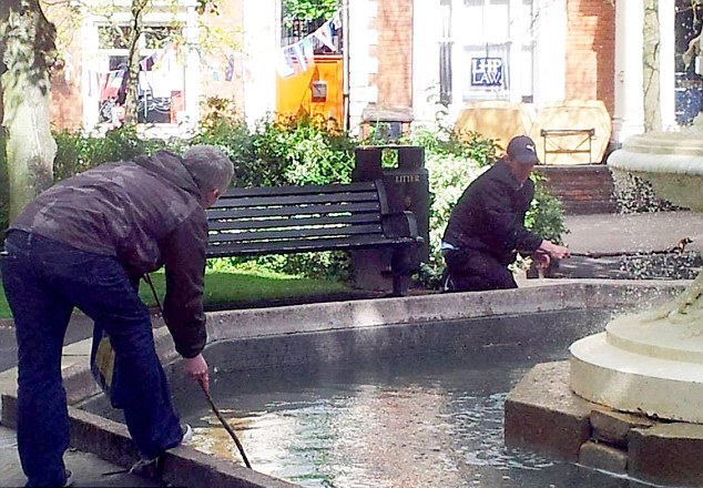 Οι δύο άντρες γέρνουν στην άκρη του συντριβανιού και προσπαθούν με τη βοήθεια ξύλων ή με τα γυμνά τους χέρια, που βουτούν στο νερό, να μαζέψουν τα πολυπόθητα κέρματα από τον πάτο.