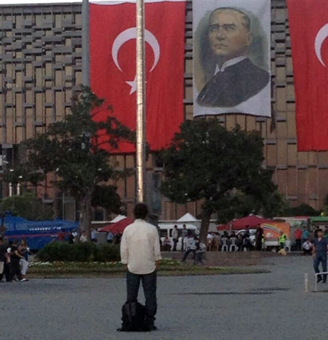 Όλο και περισσότερο ενδιαφέρον προκαλεί στην Τουρκία, αλλά και σε άλλες χώρες, ο Τούρκος που πραγματοποιούσε παθητική διαμαρτυρία από τις 18.00 χθες το απόγευμα και στεκόταν απλώς όρθιος στο κέντρο της πλατείας Ταξίμ στην Κωνσταντινούπολη.