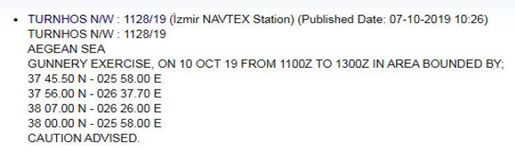Παράλληλα η Άγκυρα δέσμευσε σήμερα για τις 10 Οκτωβρίου την θαλάσσια περιοχή μεταξύ Λέσβου Σάμου και Ικαρίας για άσκηση με την χρήση όπλων.