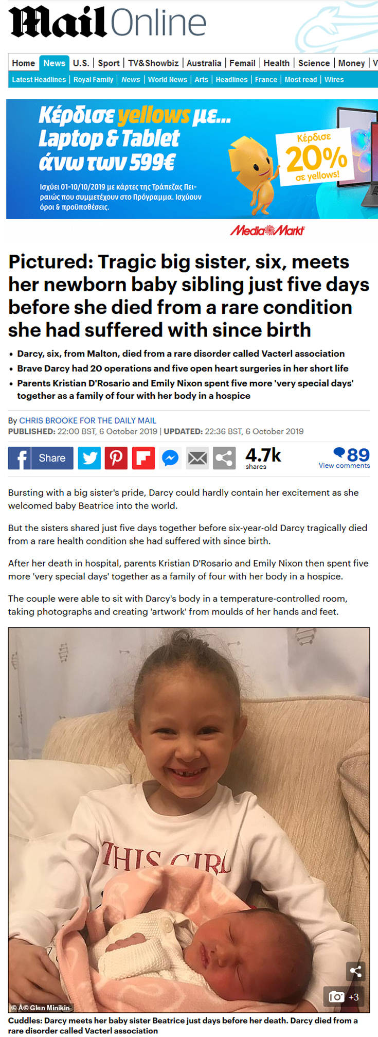 Ο Darcy είχε μια σπάνια διαταραχή που ονομάζεται Vacterl, η οποία επηρεάζει πολλά όργανα του σώματος. Είχε κάνει 20 χειρουργικές επεμβάσεις στη σύντομη ζωή της.