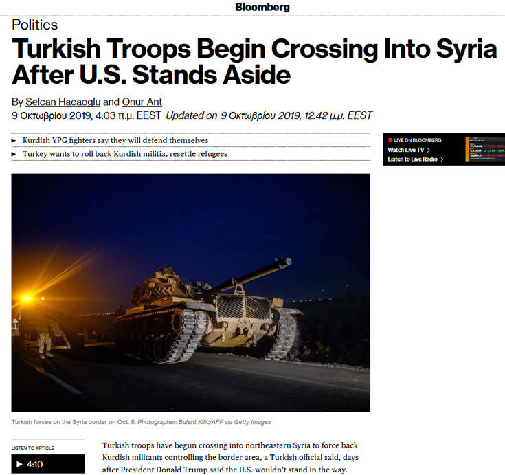 Μικρή ομάδα των τουρκικών δυνάμεων, σύμφωνα με το δημοσίευμα, μπήκε στη Συρία νωρίς σήμερα σε δύο σημεία κατά μήκος των συνόρων, κοντά στις συριακές πόλεις Tal Abyad και Ras al-Ayn, καθώς προετοιμάζεται η ευρύτερη εισβολή, σύμφωνα με τον Τούρκο αξιωματούχο.