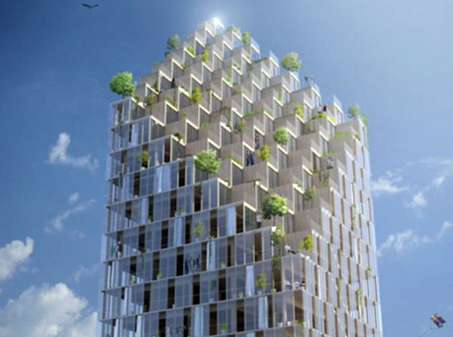 Το ευφάνταστο σχέδιο δημιουργήθηκε για αρχιτεκτονικό διαγωνισμό και έχει ακόμα πολλά χαρακτηριστικά- εκτός του ξύλου- με στόχο τη βελτίωση της «πράσινης» εικόνας του: ηλιακά πάνες θα ηλεκτροδοτούν τον ουρανοξύστη και κάθε διαμέρισμα θα έχει μια κλειστή βεράντα.