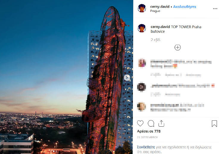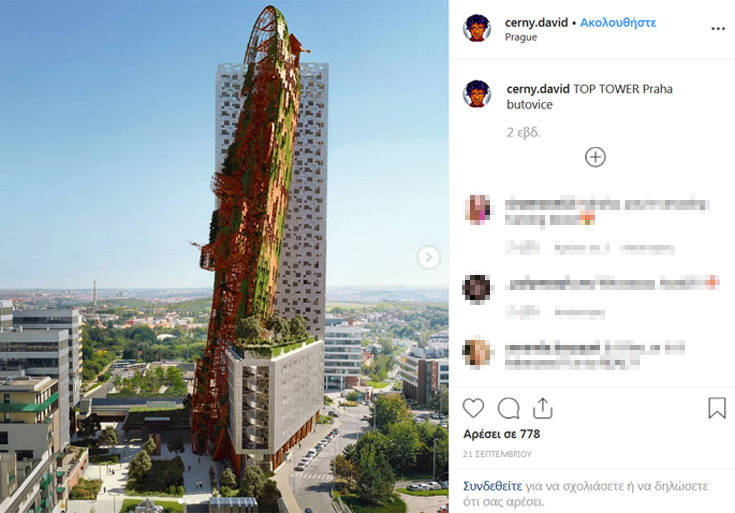 Το ιδιαίτερο κτίσμα σχεδιάστηκε από τον γλύπτη David Cerny και τον αρχιτέκτονα Tomás Cisar του αρχιτεκτονικού γραφείου Black N’ Arch, ακούει στο όνομα «Top Tower» και θα βρίσκεται στη συνοικία Nove Butovice της Πράγας.