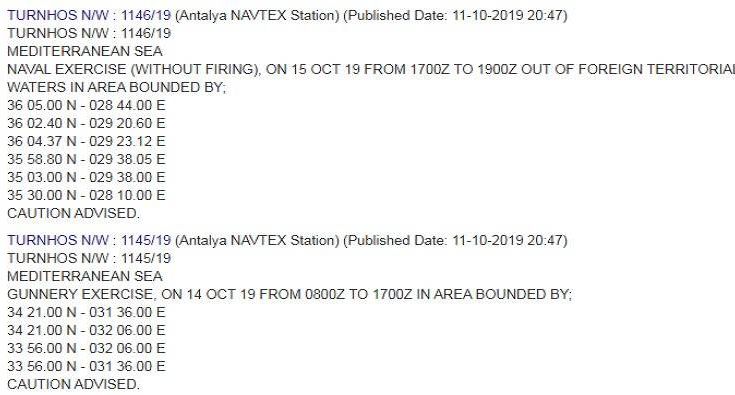 Η δεύτερη είναι νοτιοδυτικά της Πάφου και με αυτή η Τουρκία εξαγγέλλει άσκηση με την χρήση όπλων την Δευτέρα 14 Οκτωβρίου.